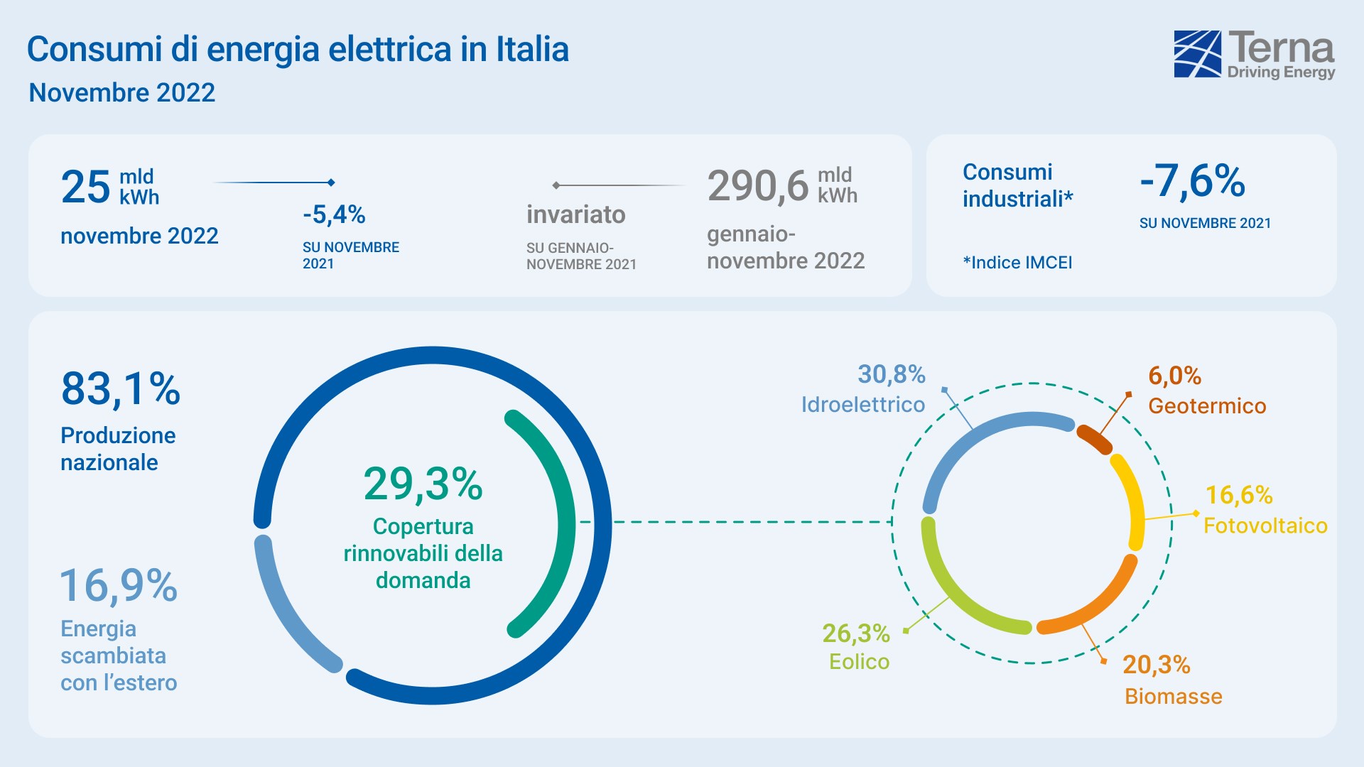 In particolare, il 22 novembre 2022, in una settimana caratterizzata da elevata ventosità, è stata registrata la giornata con la maggior produzione eolica dal 2018. La produzione delle fonti rinnovabili è stata così suddivisa nel mese di novembre: 30,8% idrico, 26,3% eolico, 20,3% biomasse, 16,6% fotovoltaico e 6% geotermico. In forte calo la produzione di energia termica (-18,9%), mentre il saldo import-export ha visto una variazione complessiva pari a +93,8%, dovuta a una diminuzione dell’export (-40,9%) e una crescita dell’import (+65,7%).